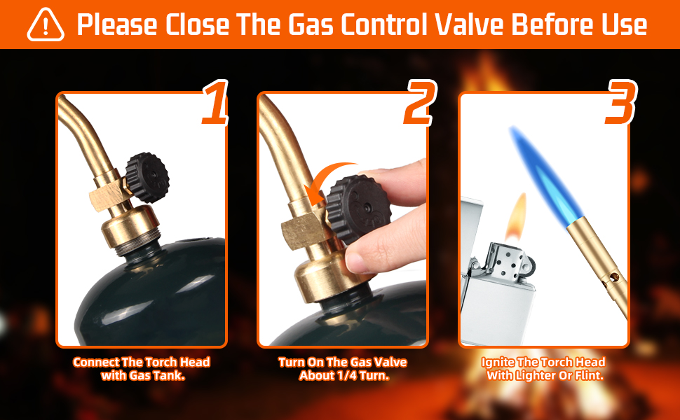 1. Connect the torch head with gas tank. 2. Turn on the gas valve about 1/4 turn. 3. Ignite the torch head with lighter or flint.