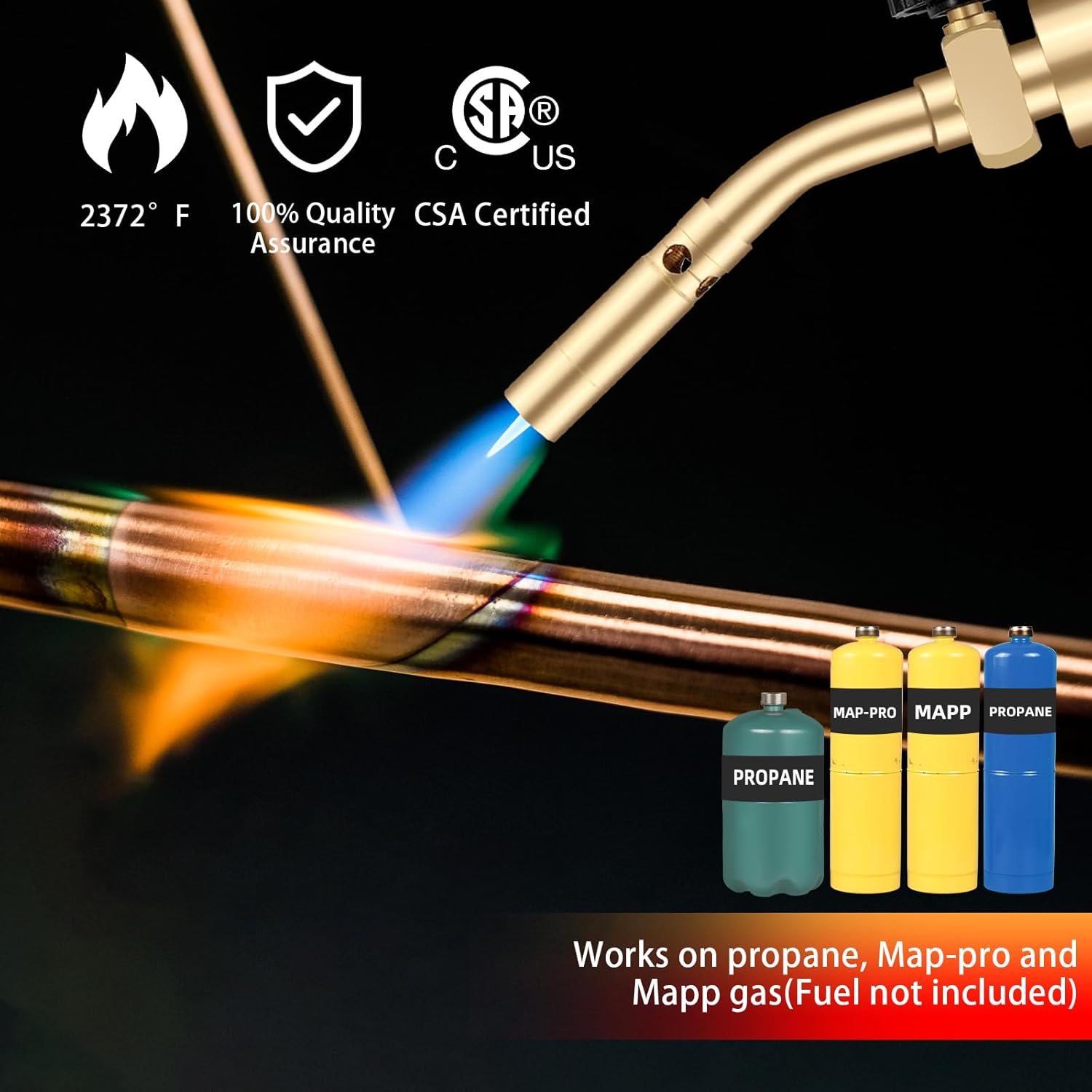 Made of premium quality solid brass, the only plastic part of welding torch is gas valve. The working temperature can up to 2372 ℉.